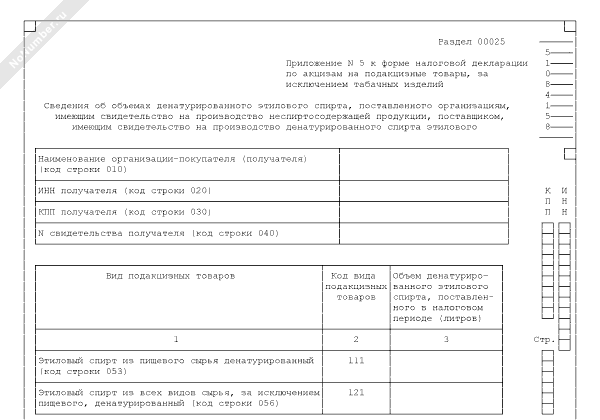 - 2501Сведения об объемах денатурированного этилового спирта, поставленного организациям, имеющим свидетельство на производство неспиртосодержащей продукции, поставщиком, имеющим свидетельство на производство денатурированного спирта этилового (приложение к налоговой декларации по акцизам на подакцизные товары, за исключением табачных изделий)