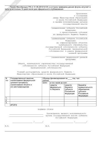 - 2530Сведения об объекте (объектах) капитального строительства государственной собственности субъекта Российской Федерации (муниципальной собственности) и объемах финансирования (приложение к соглашению о предоставлении субсидии из федерального бюджета бюджету субъекта Российской Федерации на софинансирование объектов капитального строительства государственной собственности субъекта Российской Федерации (муниципальной собственности) в рамках федеральной целевой программы)