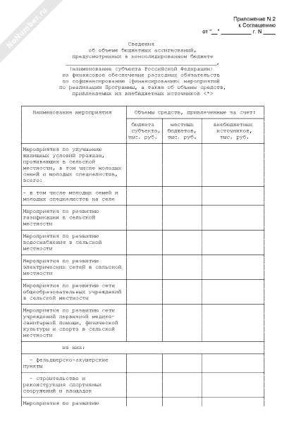 - 2522Сведения об объеме бюджетных ассигнований, предусмотренных в консолидированном бюджете субъекта Российской Федерации на финансовое обеспечение расходных обязательств по софинансированию (финансированию) мероприятий по реализации Программы, а также об объеме средств, привлекаемых из внебюджетных источников (приложение к соглашению о порядке и условиях предоставления субсидий из федерального бюджета бюджету субъекта Российской Федерации на мероприятия по улучшению жилищных условий граждан, проживающих в сельской местности)