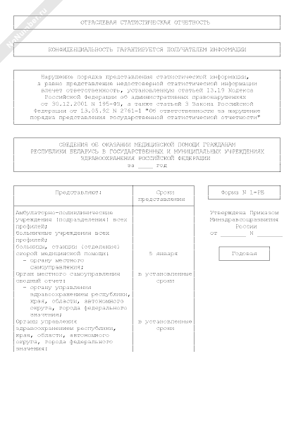 - 2539Сведения об оказании медицинской помощи гражданам Республики Беларусь в государственных и муниципальных учреждениях здравоохранения Российской Федерации. Форма № 1-РБ
