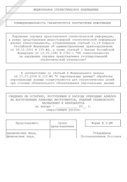 - 2623Сведения об остатках, поступлении и расходе природных алмазов на изготовление алмазных инструментов, изделий технического назначения и бриллиантов. Форма № 3-ДМ (полугодовая)