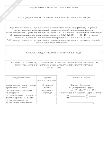 - 2625Сведения об остатках, поступлении и расходе топливно-энергетических ресурсов, сборе и использовании отработанных нефтепродуктов. Форма № 4-ТЭР (годовая)