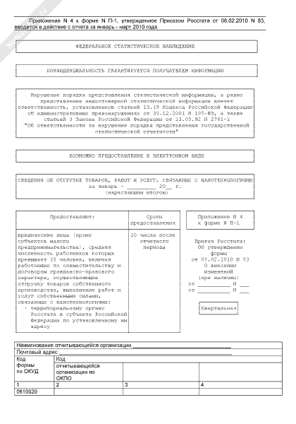 - 2636Сведения об отгрузке товаров, работ и услуг, связанных с нанотехнологиями (приложение № 4 к форме № П-1) (квартальная)