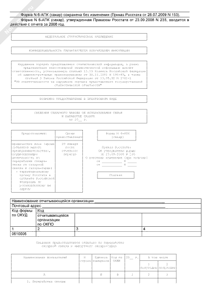- 2804Сведения сахарного завода об использовании сырья и выработке сахара. Форма № 6-АПК (сахар) (годовая)