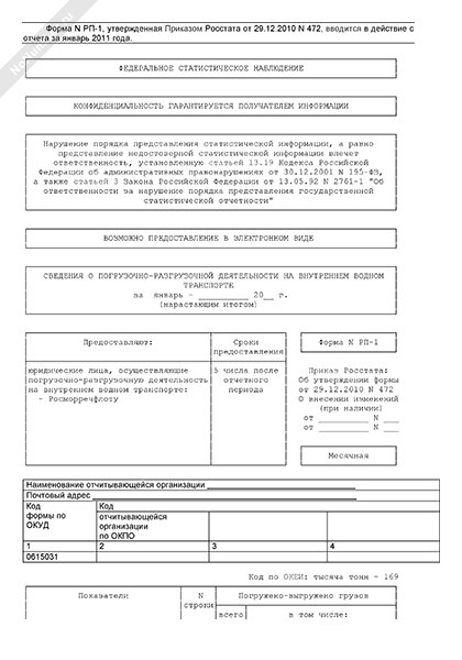 - 2982Сведения о погрузочно-разгрузочной деятельности на внутреннем водном транспорте. Форма № РП-1 (месячная)