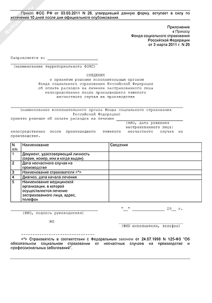- 2990Сведения о принятом решении исполнительным органом Фонда социального страхования Российской Федерации об оплате расходов на лечение застрахованного лица непосредственно после произошедшего тяжелого несчастного случая на производстве