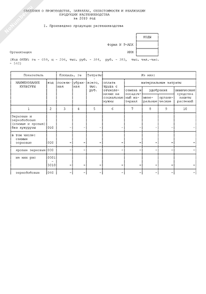 - 2991Сведения о производстве, затратах, себестоимости и реализации продукции растениеводства товаропроизводителями агропромышленного комплекса за 2010 год. Форма № 9-АПК