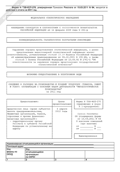 - 3024Сведения о расходах на производство и продажу продукции (товаров, работ и услуг) организации с основным видом деятельности «Металлургическое производство» 2011 год. Форма № ТЗВ-КСП-270 (приложение к форме N 1-предприятие)