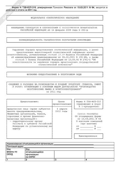 - 3028Сведения о расходах на производство и продажу продукции (товаров, работ и услуг) организации с основным видом деятельности «Производство электрических машин и электрооборудования» за 2011 год. Форма № ТЗВ-КСП-310 (приложение к форме от 15.03.2011 N 64)