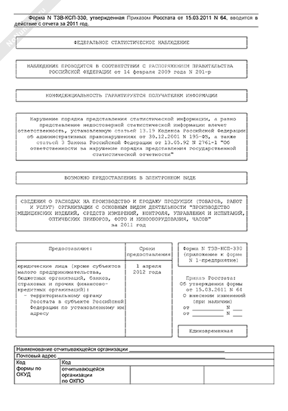 - 3030Сведения о расходах на производство и продажу продукции (товаров, работ и услуг) организации с основным видом деятельности «Производство медицинских изделий, средств измерений, контроля, управления и испытаний, оптических приборов, фото и кинооборудования, часов» за 2011 год. Форма № ТЗВ-КСП-330 (приложение к форме N 1-предприятие)