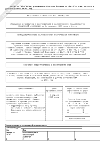 - 3033Сведения о расходах на производство и продажу продукции (товаров, работ и услуг) организации с основным видом деятельности «Производство мебели и прочей продукции, не включенной в другие группировки» за 2011 год. Форма № ТЗВ-КСП-360 (приложение к форме N 1-предприятие)