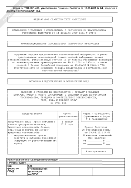 - 3035Сведения о расходах на производство и продажу продукции (товаров, работ и услуг) организации с основным видом деятельности «Производство, передача и распределение электроэнергии, газа, пара и горячей воды» за 2011 год. Форма № ТЗВ-КСП-400 (приложение к форме N 1-предприятие)