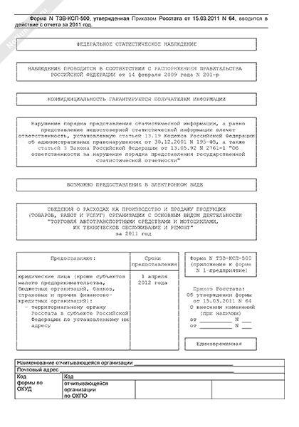 - 3038Сведения о расходах на производство и продажу продукции (товаров, работ и услуг) организации с основным видом деятельности «Торговля автотранспортными средствами и мотоциклами, их техническое обслуживание и ремонт» за 2011 год. Форма № ТЗВ-КСП-500 (приложение к форме N 1-предприятие)