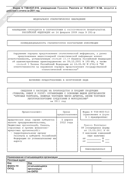- 3040Сведения о расходах на производство и продажу продукции (товаров, работ и услуг) организации с основным видом деятельности «Розничная торговля, кроме торговли автотранспортными средствами и мотоциклами» за 2011 год. Форма № ТЗВ-КСП-529 (приложение к форме N 1-предприятие)