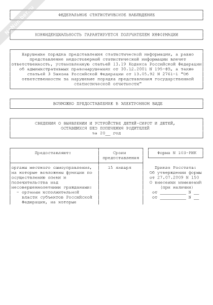 - 316Сведения о выявлении и устройстве детей-сирот и детей, оставшихся без попечения родителей. Форма № 103-РИК (годовая)