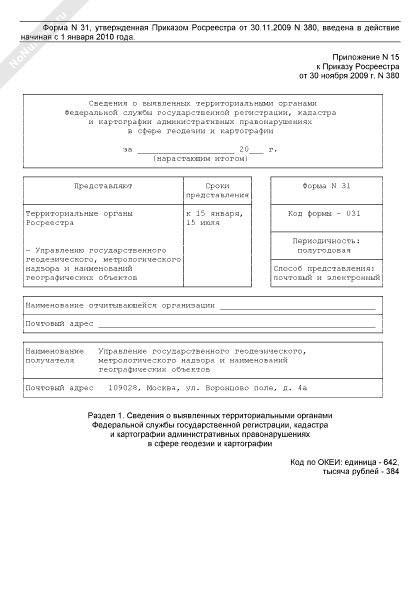 - 303Сведения о выявленных территориальными органами Федеральной службы государственной регистрации, кадастра и картографии административных правонарушениях в сфере геодезии и картографии. Форма № 31 (полугодовая)