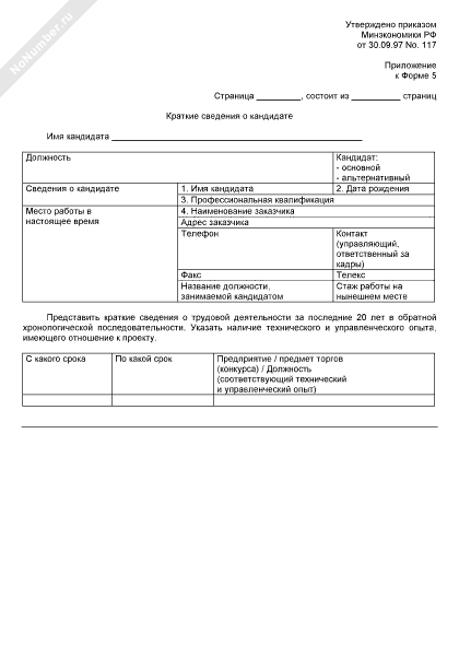 - 43Краткие сведения о кандидате (приложение к форме № 5 письма-заявки на участие в предварительном квалификационном отборе подрядчиков для последующего участия в торгах (конкурсе))