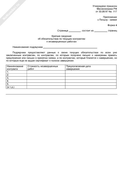 - 42Краткие сведения об обязательствах по текущим контрактам и незавершенным работам (приложение к письму-заявке на участие в предварительном квалификационном отборе подрядчиков для последующего участия в торгах (конкурсе)) (форма № 4)