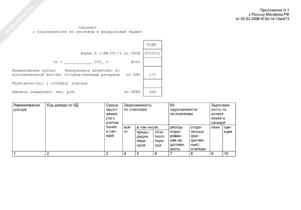 - 582Сведения о задолженности по платежам в федеральный бюджет. Форма № 1-БФ(ГР)/1