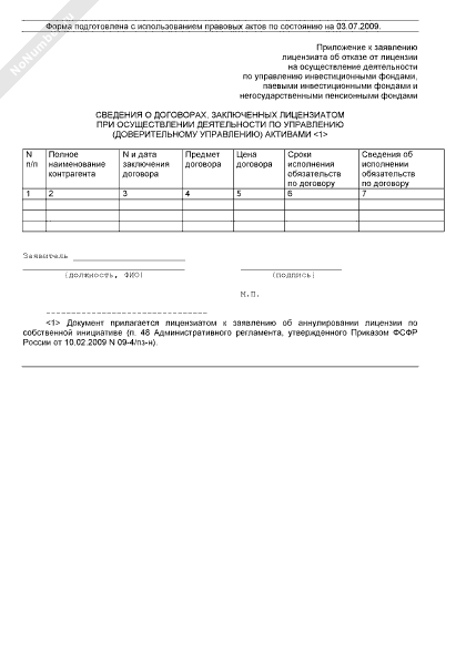- 599Сведения о заключенных договорах при осуществлении деятельности по управлению (доверительному управлению) активами (приложение к заявлению лицензиата об отказе от лицензии на осуществление деятельности по управлению инвестиционными фондами, паевыми инвестиционными фондами и негосударственными пенсионными фондами)
