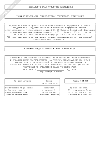 - 596Сведения о заключенных контрактах, финансировании гособоронзаказа и задолженности государственных заказчиков организациям оборонной промышленности за выполненный по государственному контракту оборонный заказ и о просроченной задолженности организаций своим работникам по заработной плате текущего года. Форма № М-ГОЗ (месячная, квартальная)
