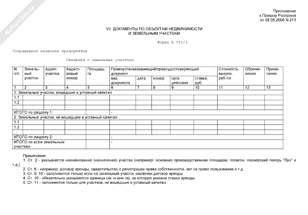 - 646Сведения о земельных участках предприятия, находящегося в сфере ведения и координации Роспрома. Форма № VII/1