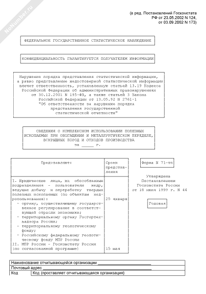 - 745Сведения о комплексном использовании полезных ископаемых при обогащении и металлургическом переделе, вскрышных пород и отходов производства. Форма № 71-тп
