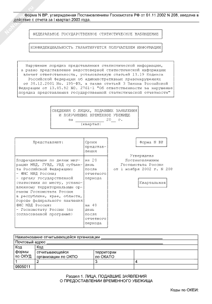 - 784Сведения о лицах, подавших заявления и получивших временное убежище. Форма № ВР