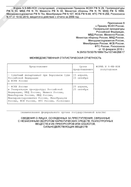 - 783Сведения о лицах, осужденных за преступления, связанные с незаконным оборотом наркотических средств, психотропных и сильнодействующих веществ. Форма № 6-МВ-НОН