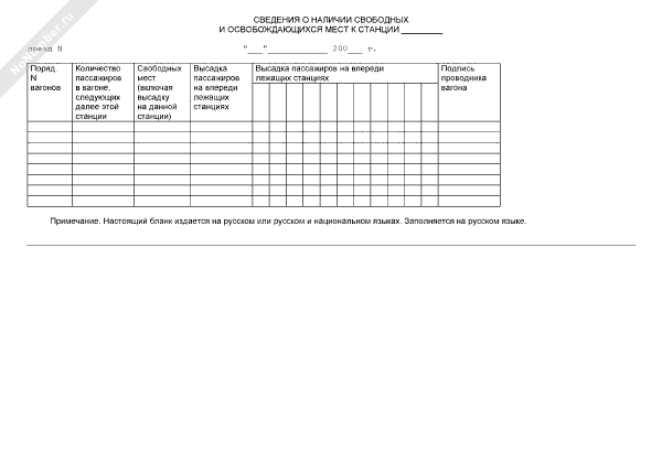 - 909Сведения о наличии свободных и освобождающихся мест к станции в международных пассажирских поездах на железных дорогах государств — участников СНГ, Латвийской Республики, Литовской Республики, Эстонской Республики. Форма № ЛУ-73