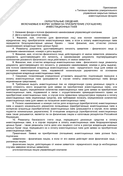- 82Обязательные сведения, включаемые в форму заявки на приобретение (погашение) инвестиционных паев (приложение к типовым правилам доверительного управления закрытым паевым инвестиционным фондом)