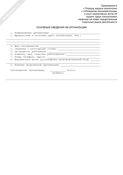 - 94Основные сведения об организации, получившей заключение о соблюдении законодательных и иных нормативных актов об охране труда для получения лицензии на осуществление предпринимательской деятельности