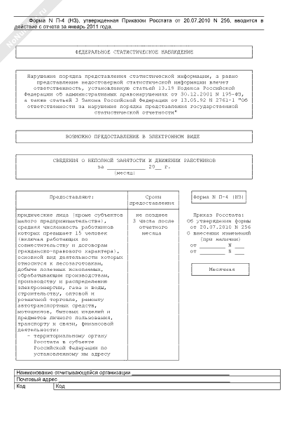 - 1011Сведения о неполной занятости и движении работников. Форма № П-4 (НЗ) (месячная)