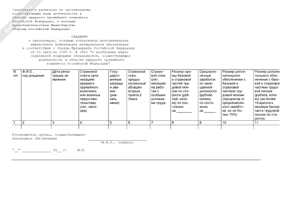 - 1034Сведения о пенсионерах, которым установлено дополнительное ежемесячное пожизненное материальное обеспечение в соответствии с Указом Президента Российской Федерации от 23 августа 2000 г. № 1563 «О неотложных мерах социальной поддержки специалистов, осуществляющих деятельность в области ядерного оружейного комплекса Российской Федерации»