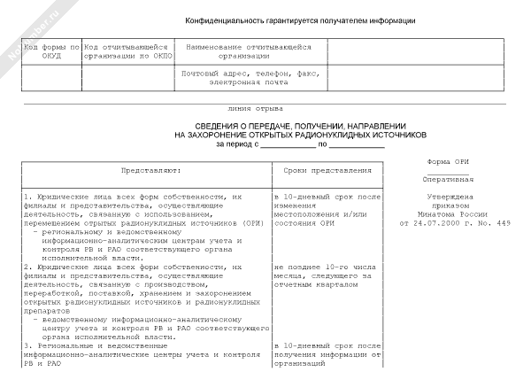 - 1039Сведения о передаче, получении, направлении на захоронение открытых радионуклидных источников. Форма № ОРИ (оперативная)