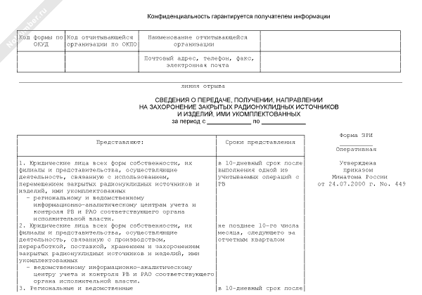 - 1038Сведения о передаче, получении, направлении на захоронение закрытых радионуклидных источников и изделий, ими укомплектованных. Форма № ЗРИ (оперативная)