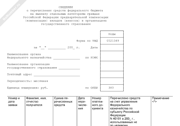 - 1050Сведения о перечислении средств федерального бюджета на выплату отдельным категориям граждан Российской Федерации предварительной компенсации (компенсации) вкладов (взносов) в организациях государственного страхования. Форма № 0521349