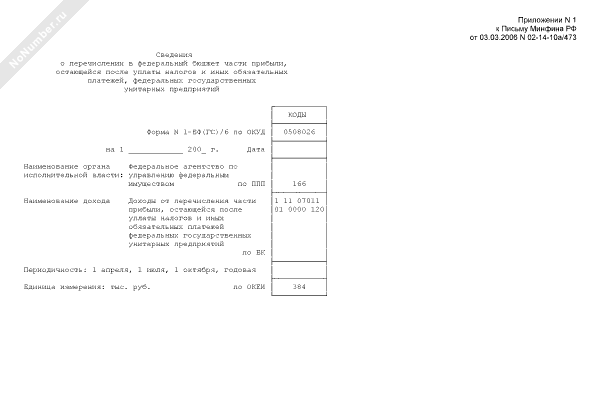 - 1046Сведения о перечислении в федеральный бюджет части прибыли, остающейся после уплаты налогов и иных обязательных платежей, федеральных государственных унитарных предприятий. Форма № 1-БФ(ГС)/6