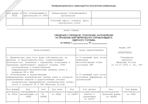 - 1041Сведения о передаче, получении, направлении на хранение или переработку отработавшего ядерного топлива. Форма № ОЯТ (оперативная)
