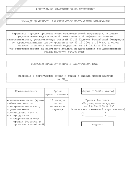 - 1056Сведения о переработке скота и птицы и выходе мясопродуктов. Форма № 9-АПК (мясо) (годовая)