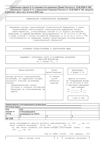- 1083Сведения о поголовье скота в хозяйствах населения сельской местности (приложение к сведениям об оценке поголовья скота и птицы, посевных площадей в хозяйствах населения. Форма № 14)