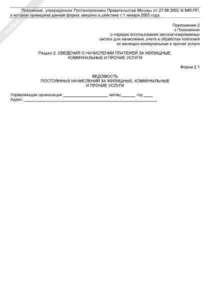 - 1140Сведения о поступлении платежей за жилищно-коммунальные и прочие услуги. Ведомость постоянных начислений за жилищные, коммунальные и прочие услуги. Форма № 2.1