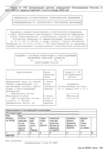 - 1165Сведения о поставке известковых и гипсосодержащих материалов сельскому хозяйству. Форма № 1-ПС (росхимизация) срочная