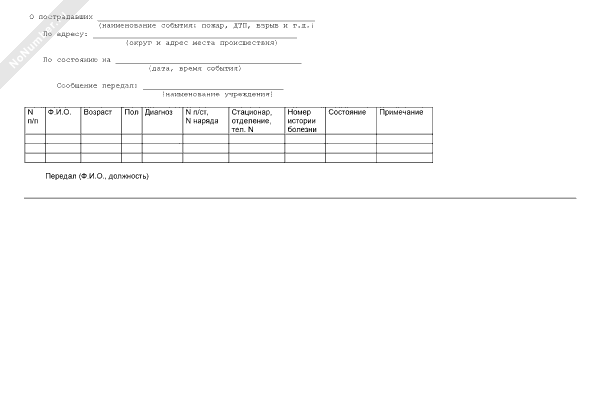 - 1164Сведения о пострадавших, обратившихся за медицинской помощью за истекшие сутки (в случаях с пострадавшими свыше 4) (форма № 2)