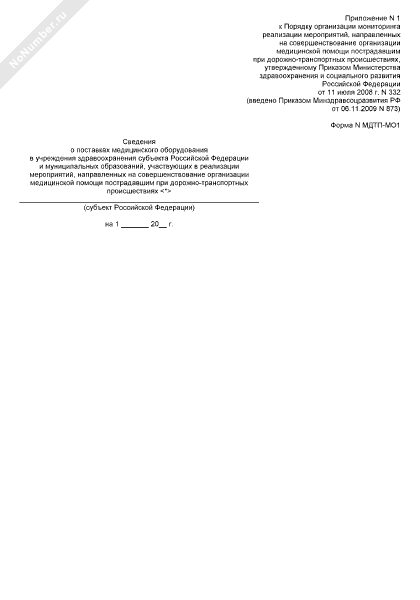 - 1200Сведения о поставках медицинского оборудования в учреждения здравоохранения субъекта Российской Федерации и муниципальных образований, участвующих в реализации мероприятий, направленных на совершенствование организации медицинской помощи пострадавшим при дорожно-транспортных происшествиях. Форма № МДТП-МО1