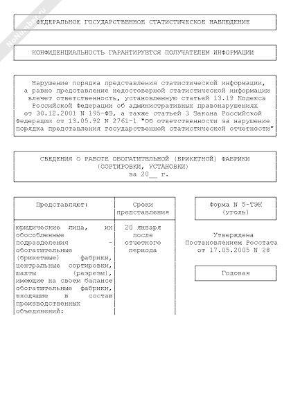- 1494Сведения о работе обогатительной (брикетной) фабрики (сортировки, установки). Форма № 5-ТЭК (уголь)