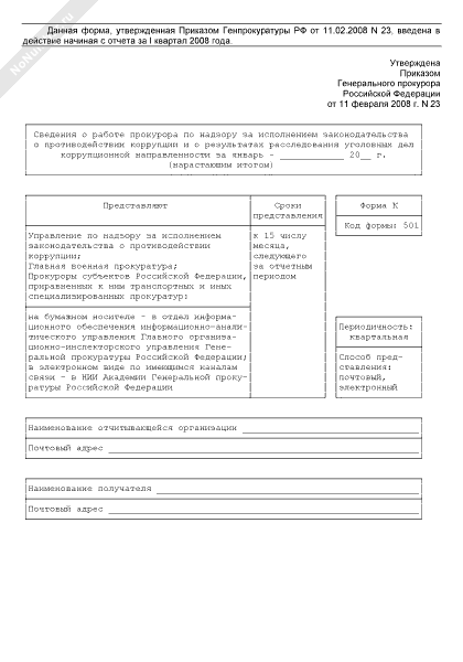 - 1488Сведения о работе прокурора по надзору за исполнением законодательства о противодействии коррупции и о результатах расследования уголовных дел коррупционной направленности. Форма № К