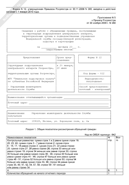 - 1500Сведения о работе с обращениями граждан, поступившими в структурные подразделения центрального аппарата, территориальные органы и подведомственные учреждения Федеральной службы государственной регистрации, кадастра и картографии. Форма № 12 (полугодовая)
