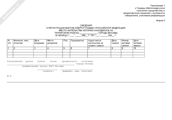 - 1654Сведения о регистрации фактов смерти граждан Российской Федерации, место жительства которых находилось на территории города Москвы (форма № 5)