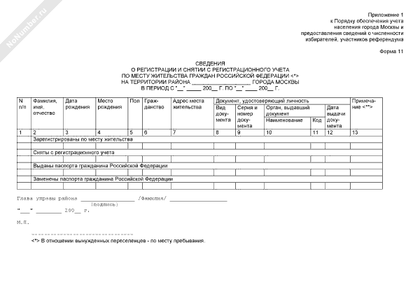 - 1650Сведения о регистрации и снятии с регистрационного учета по месту жительства граждан Российской Федерации на территории города Москвы (форма № 11)